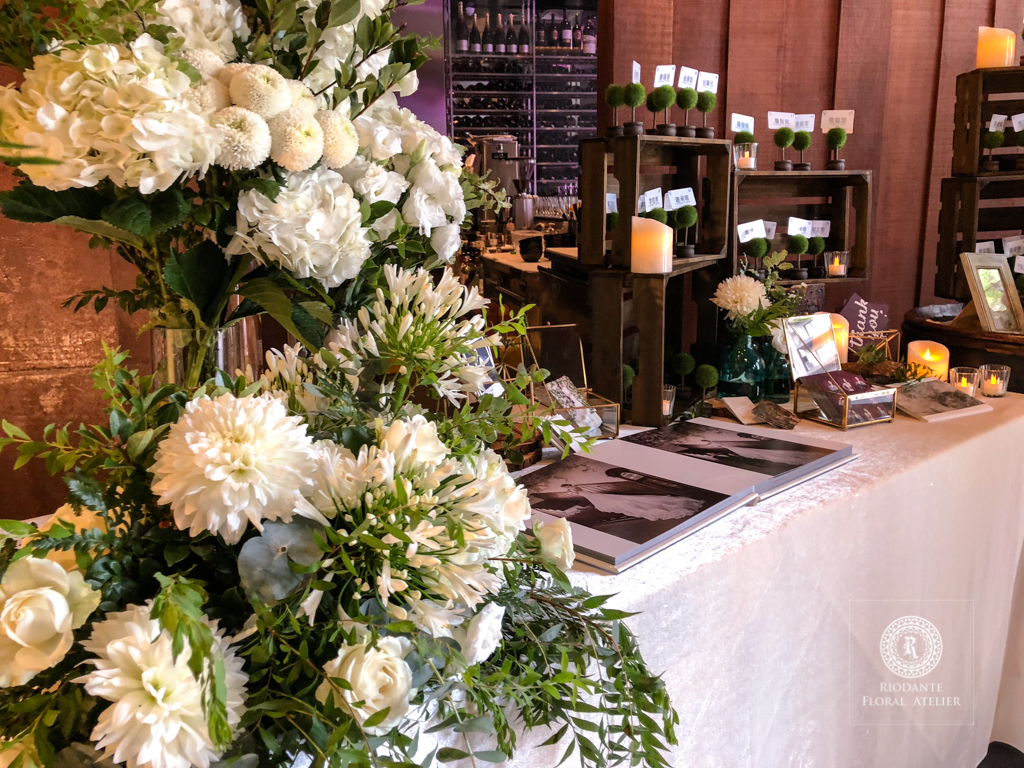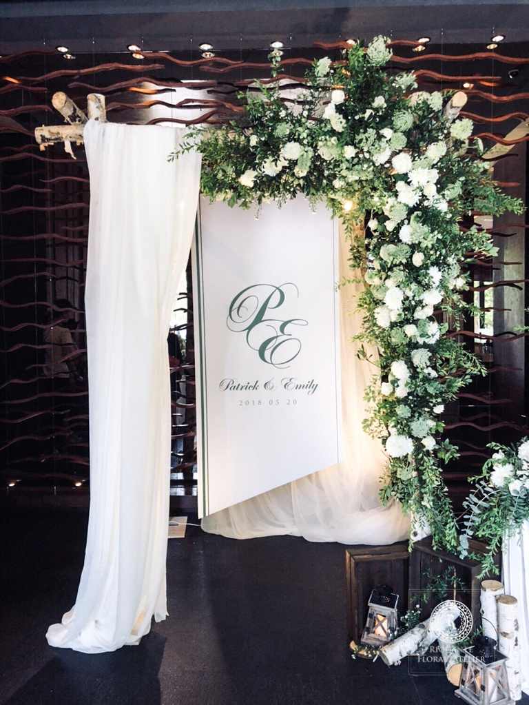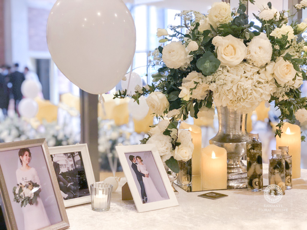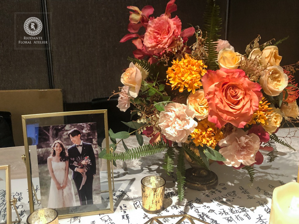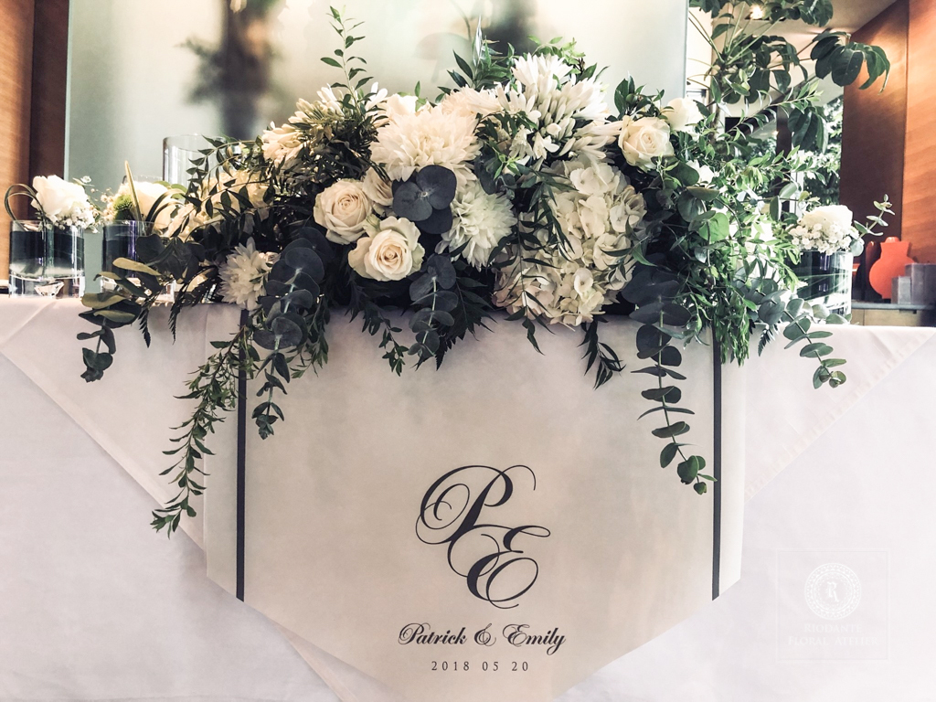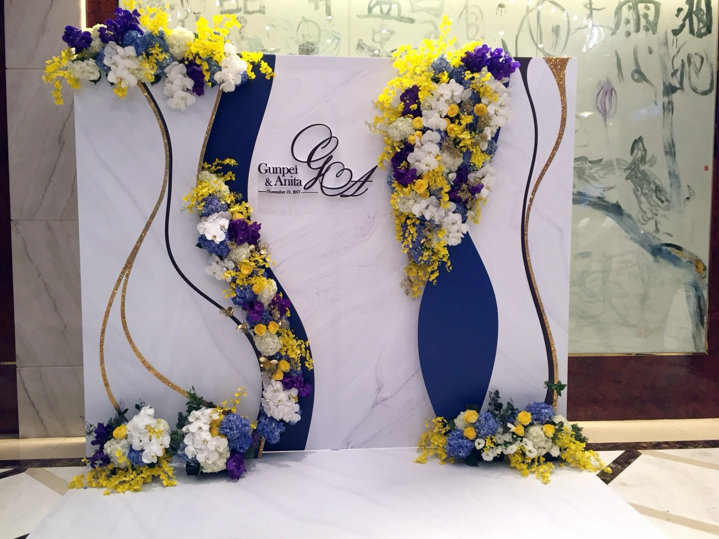 婚禮花藝佈置設計案例實照、主題拍照區花藝佈置、新人LOGO設計、禮金相本桌花藝佈置、婚宴花藝佈置整體設計規劃