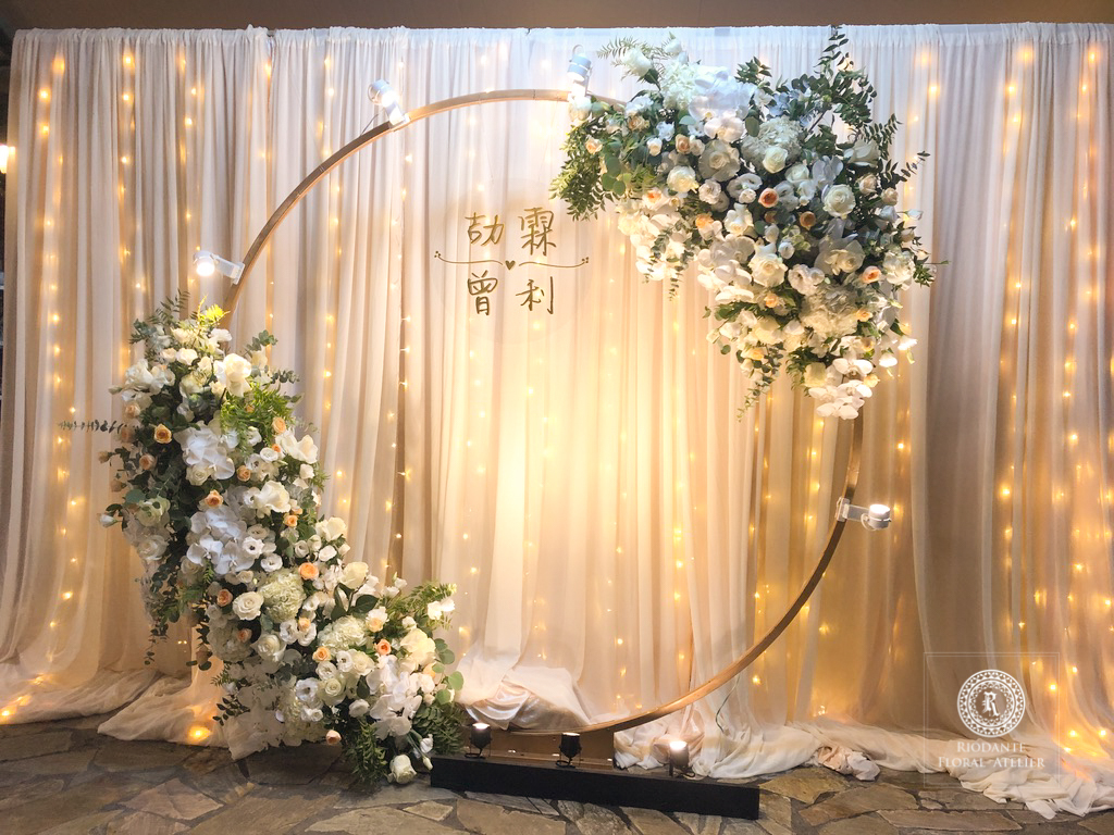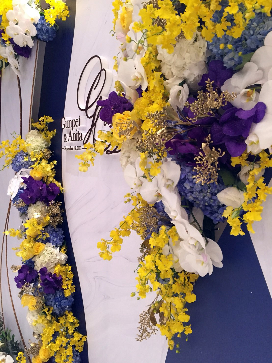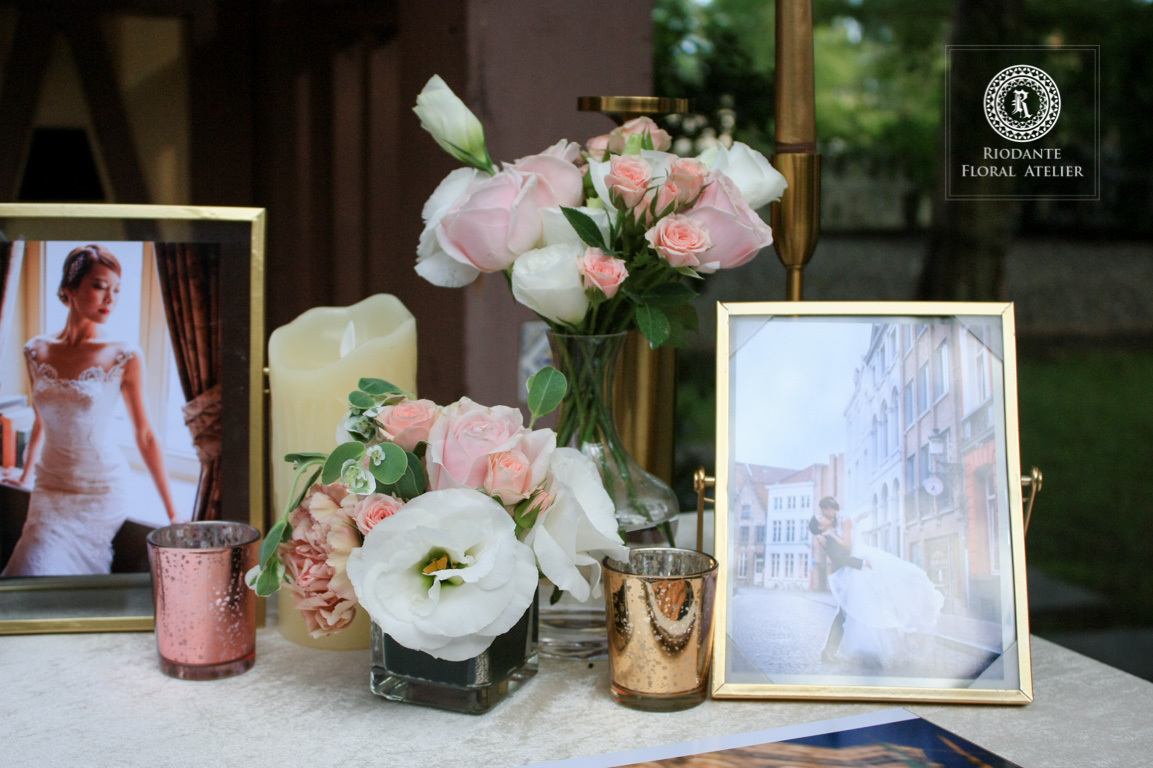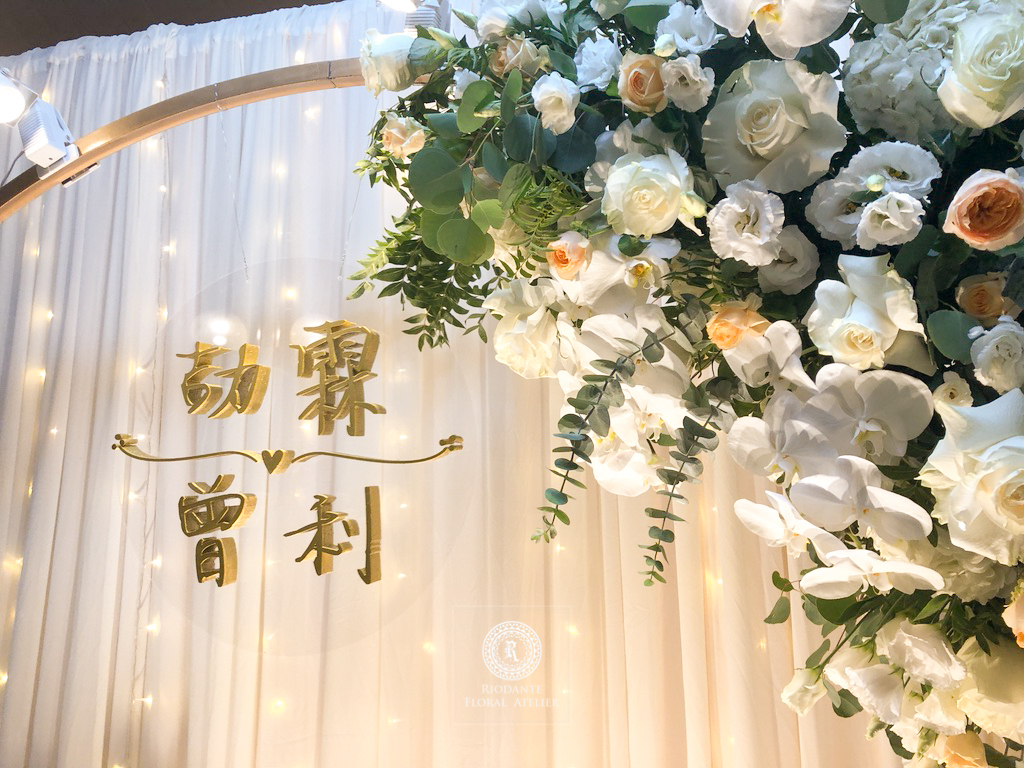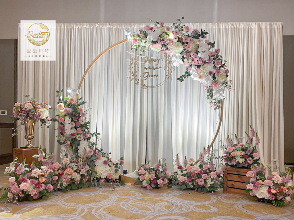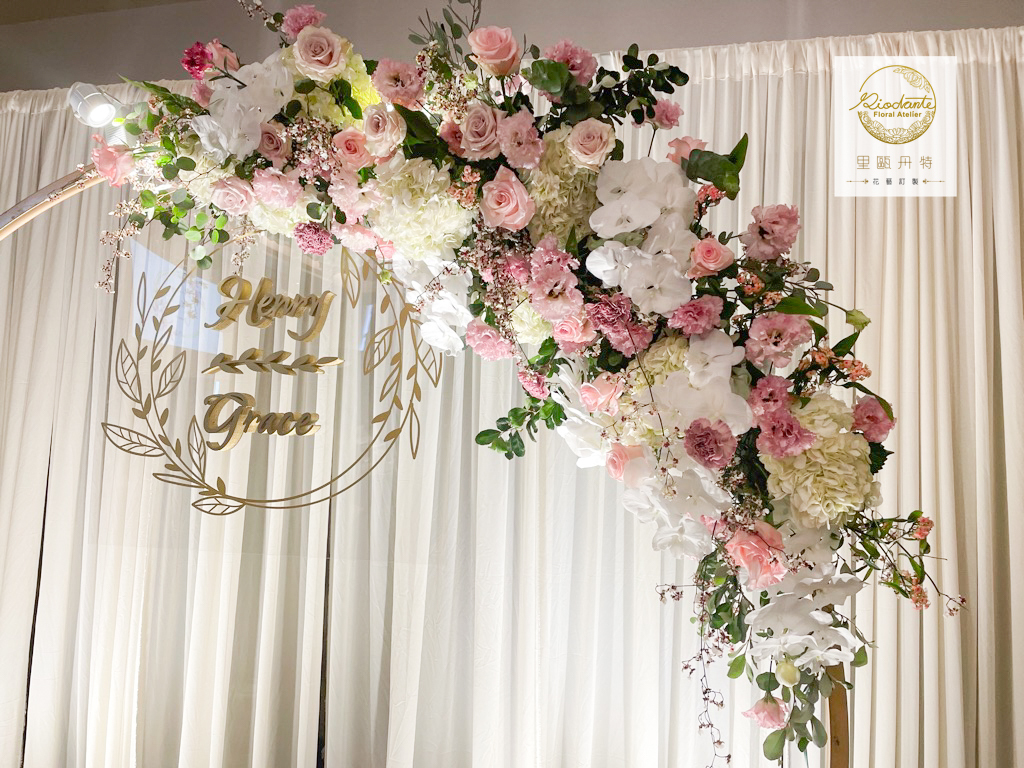 婚禮花藝佈置設計案例實照、主題拍照區花藝佈置、新人LOGO設計、禮金相本桌花藝佈置、婚宴花藝佈置整體設計規劃