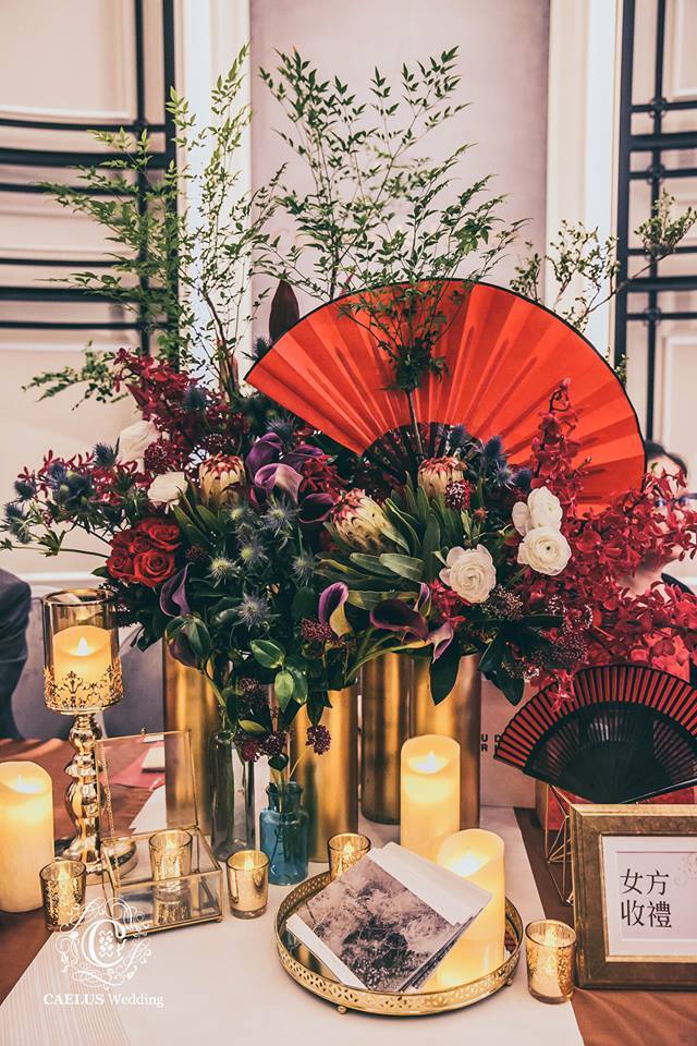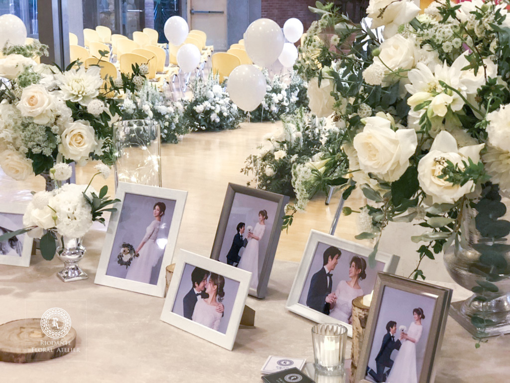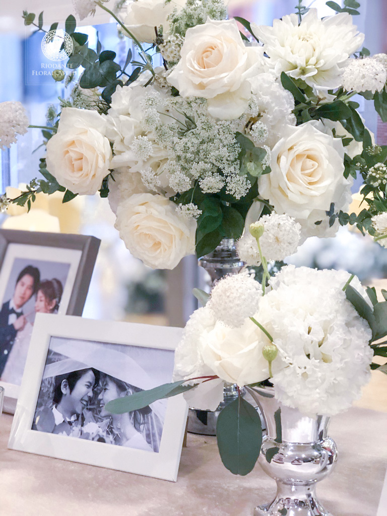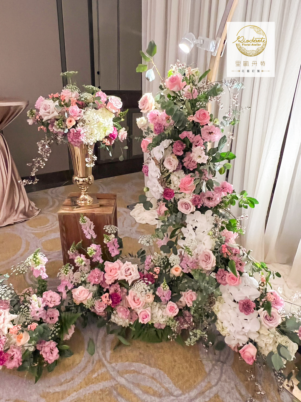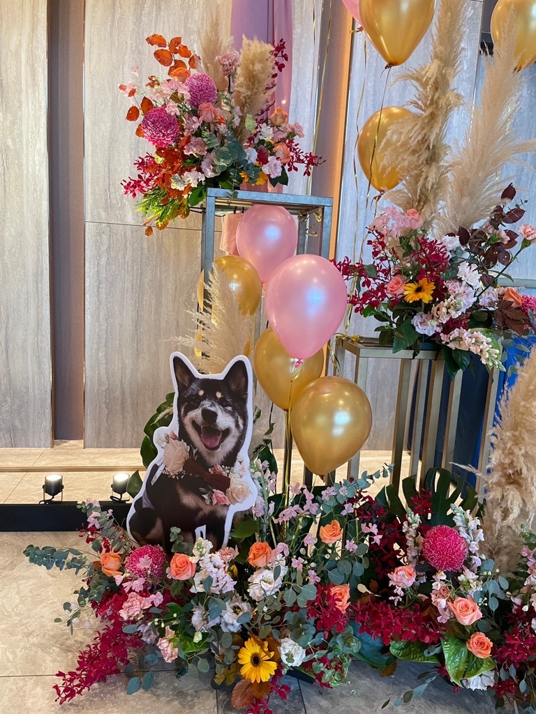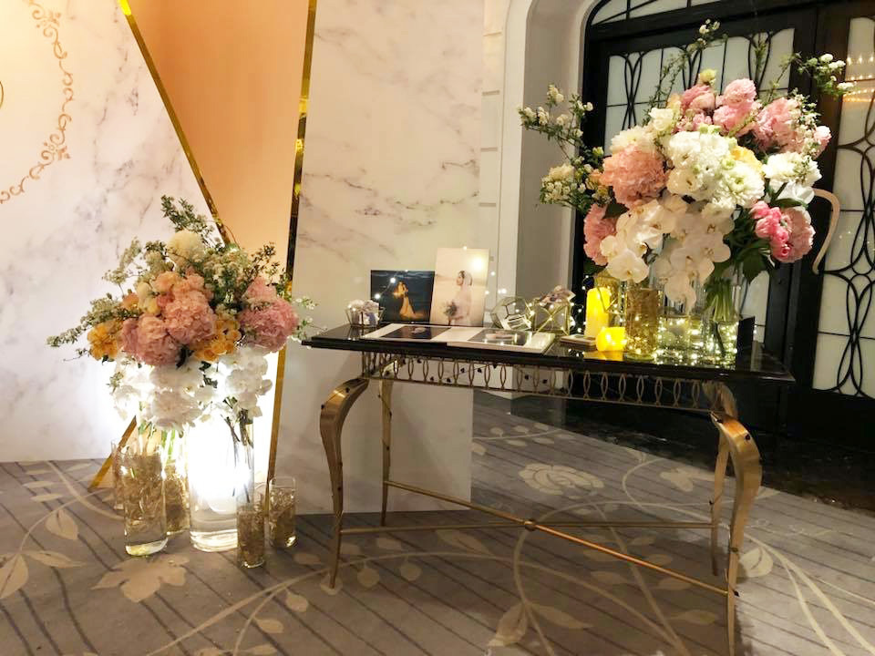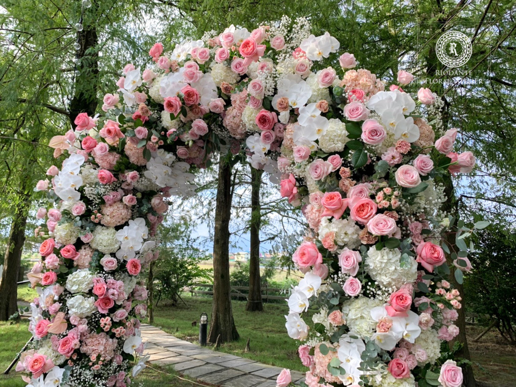 婚禮花藝佈置設計案例實照、主題拍照區花藝佈置、新人LOGO設計、禮金相本桌花藝佈置、婚宴花藝佈置整體設計規劃