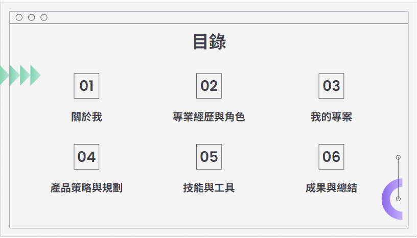 -P.5~P.11: 我挑選了過去負責的3項重要專案,分別介紹它們的背景與目標、遭遇挑戰與解決方案,以及完成後的成果。