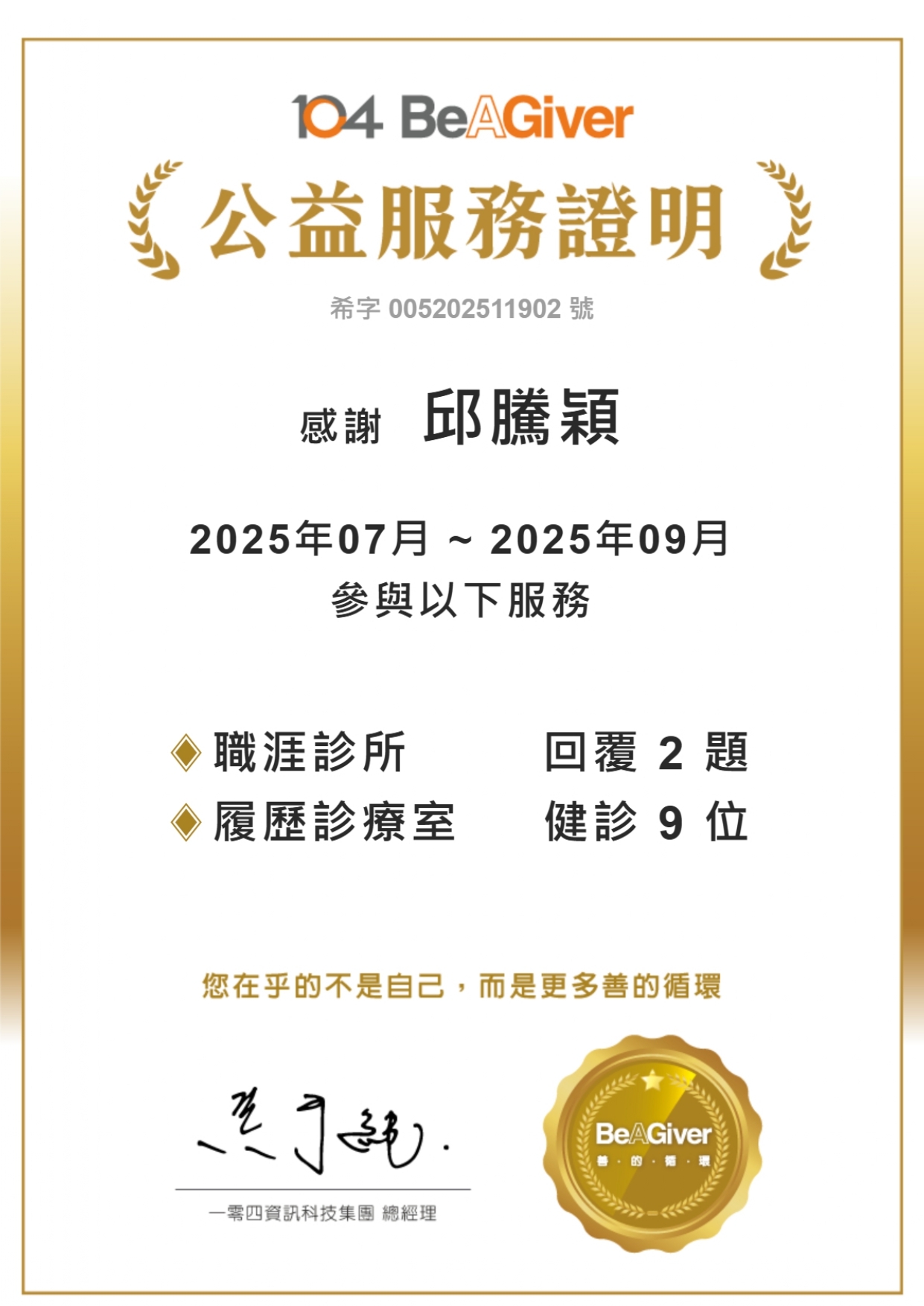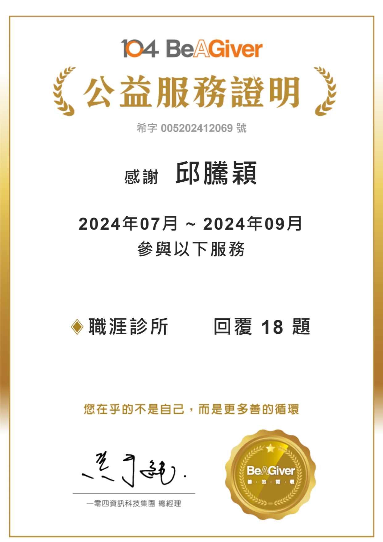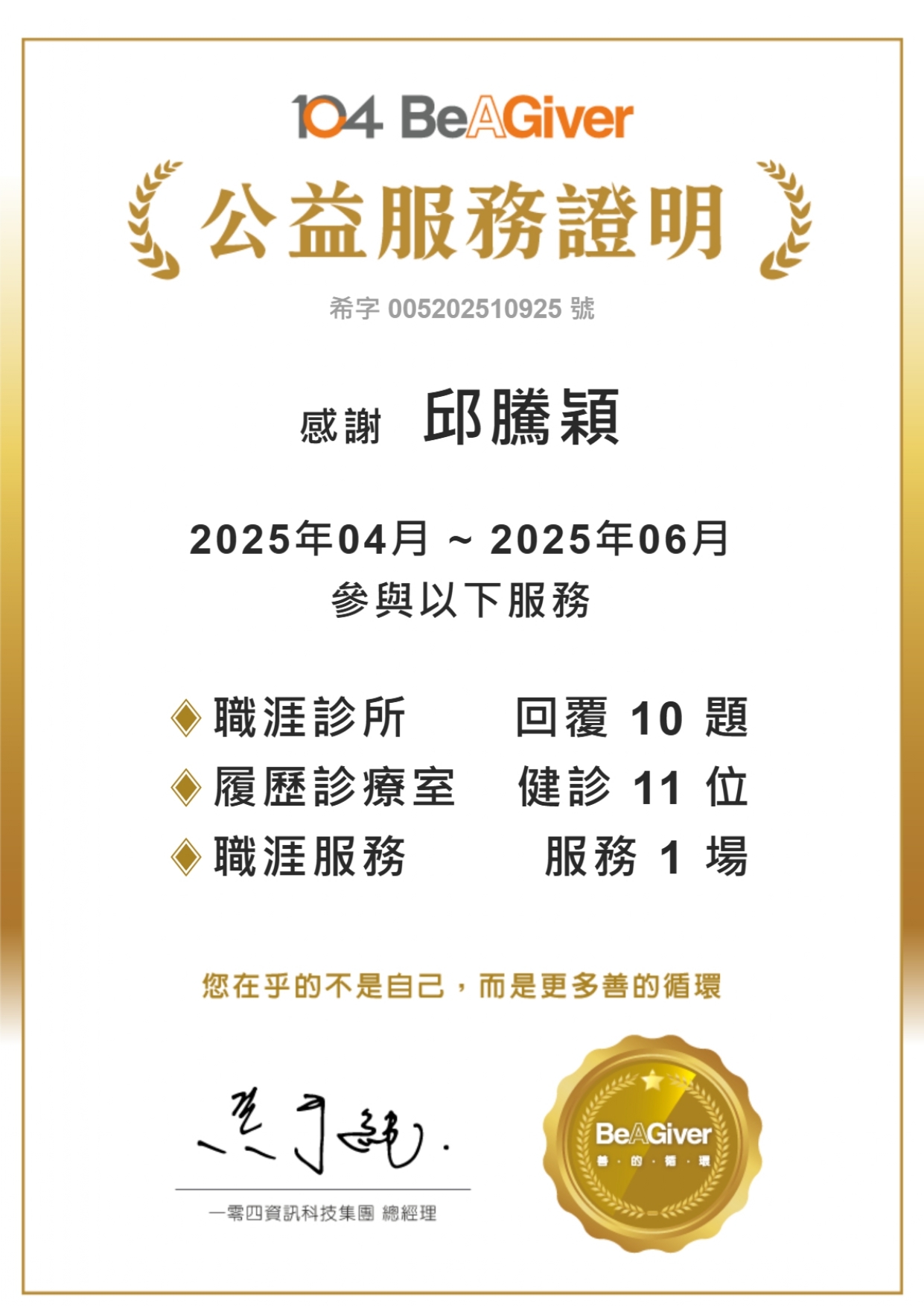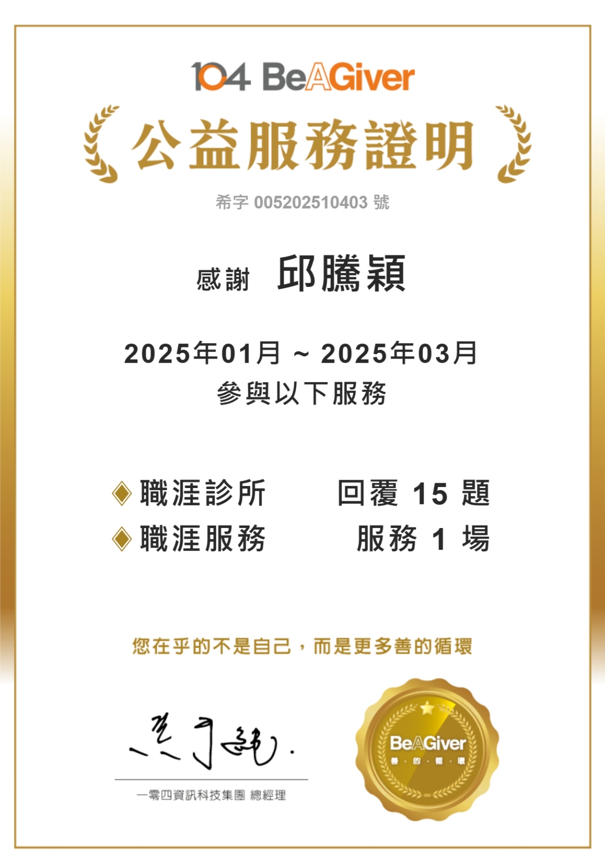 2022 年 9 月起,我開始常態性於「104 Giver」職涯志工服務平臺提供職涯志願服務。具體參與活動包含 104 職涯診所問題答覆、104 履歷診療室(線上/實體)履歷健診及模擬面試、104 學習精靈開設學習教室、104 個人品牌建立履歷範本、104 職場力無酬投稿職涯專文等。未來期待在工作之餘能加入到校分享職涯經驗的行列,幫助更多學子了解工作世界、做好提前準備。