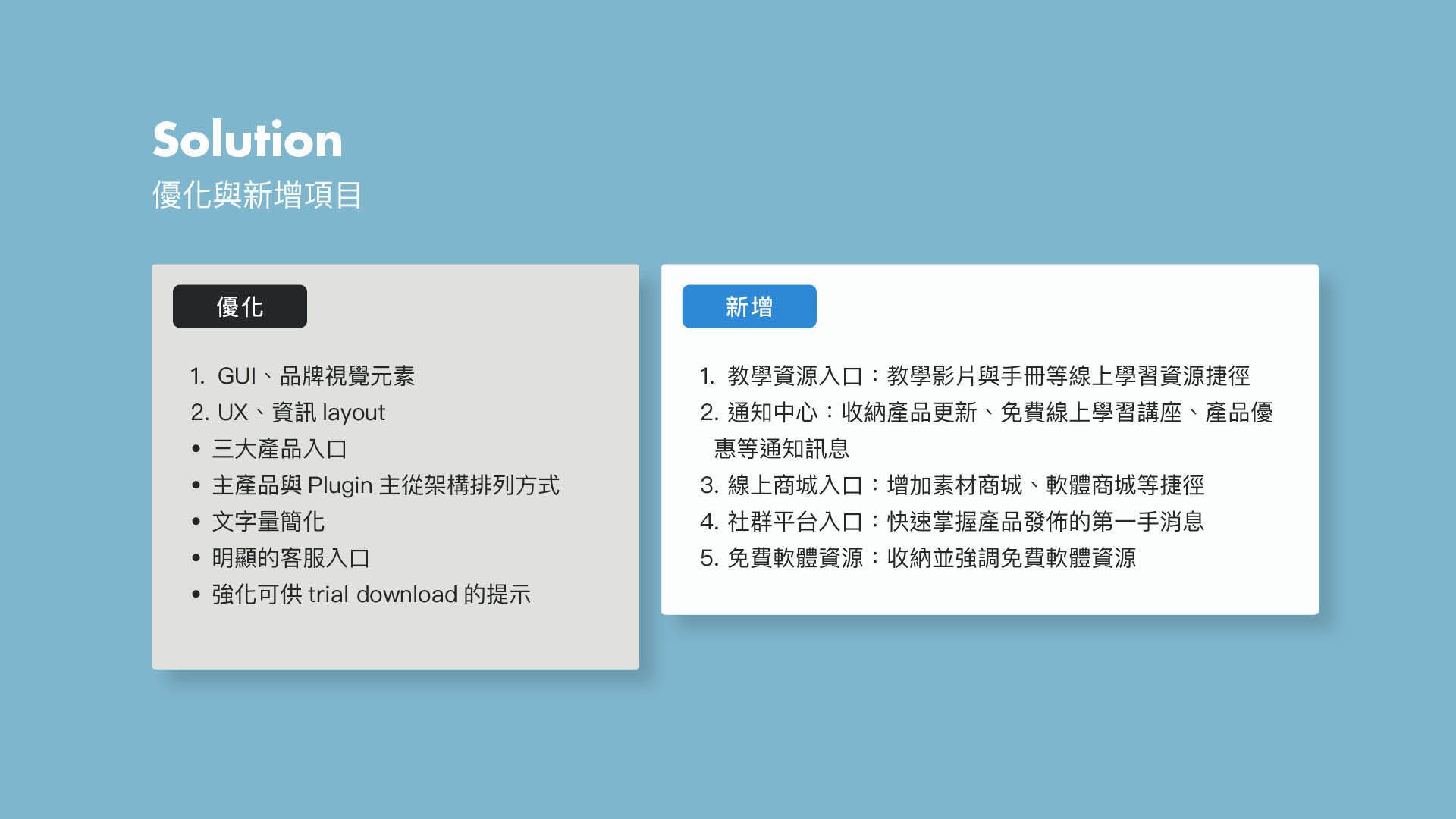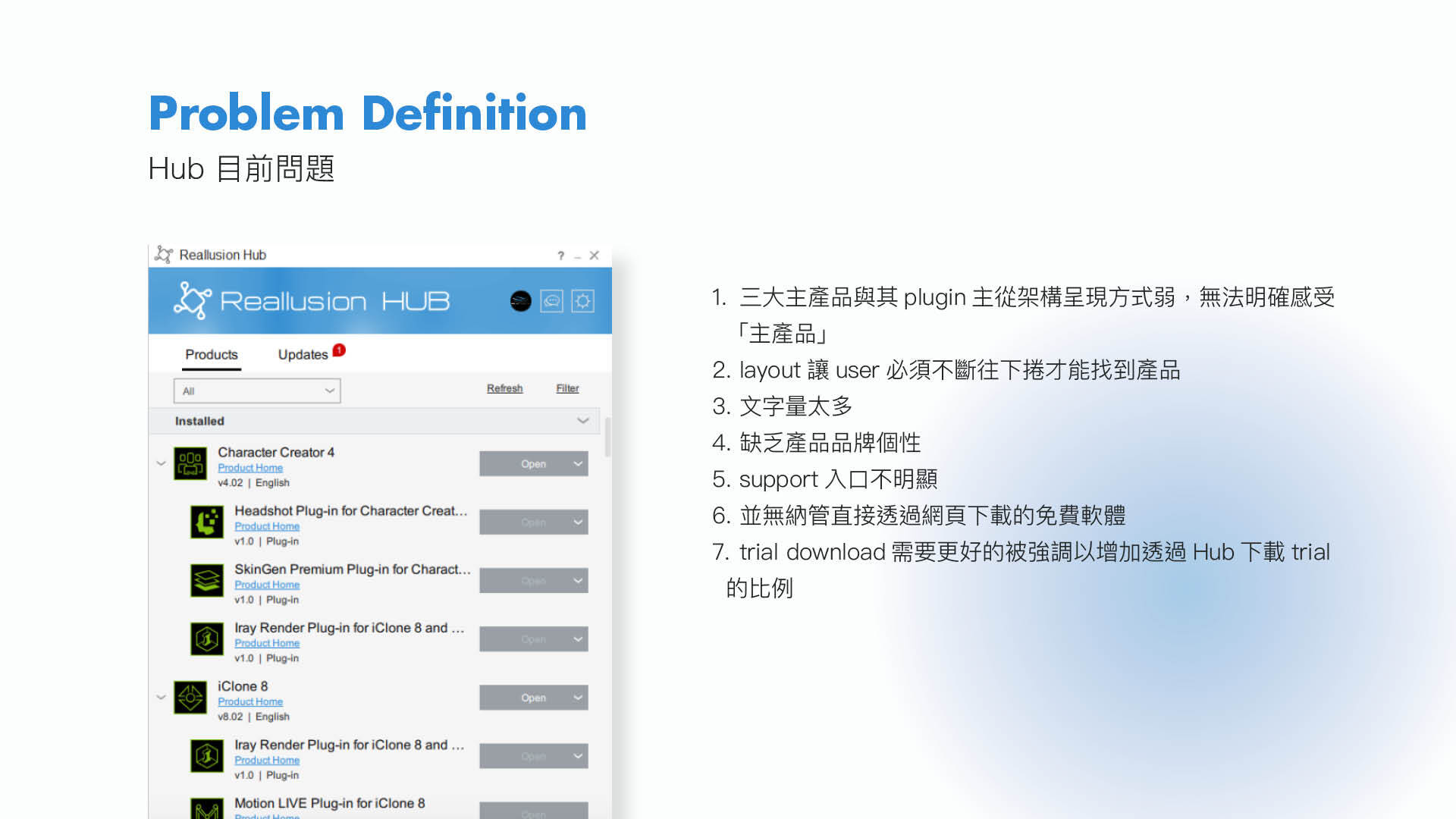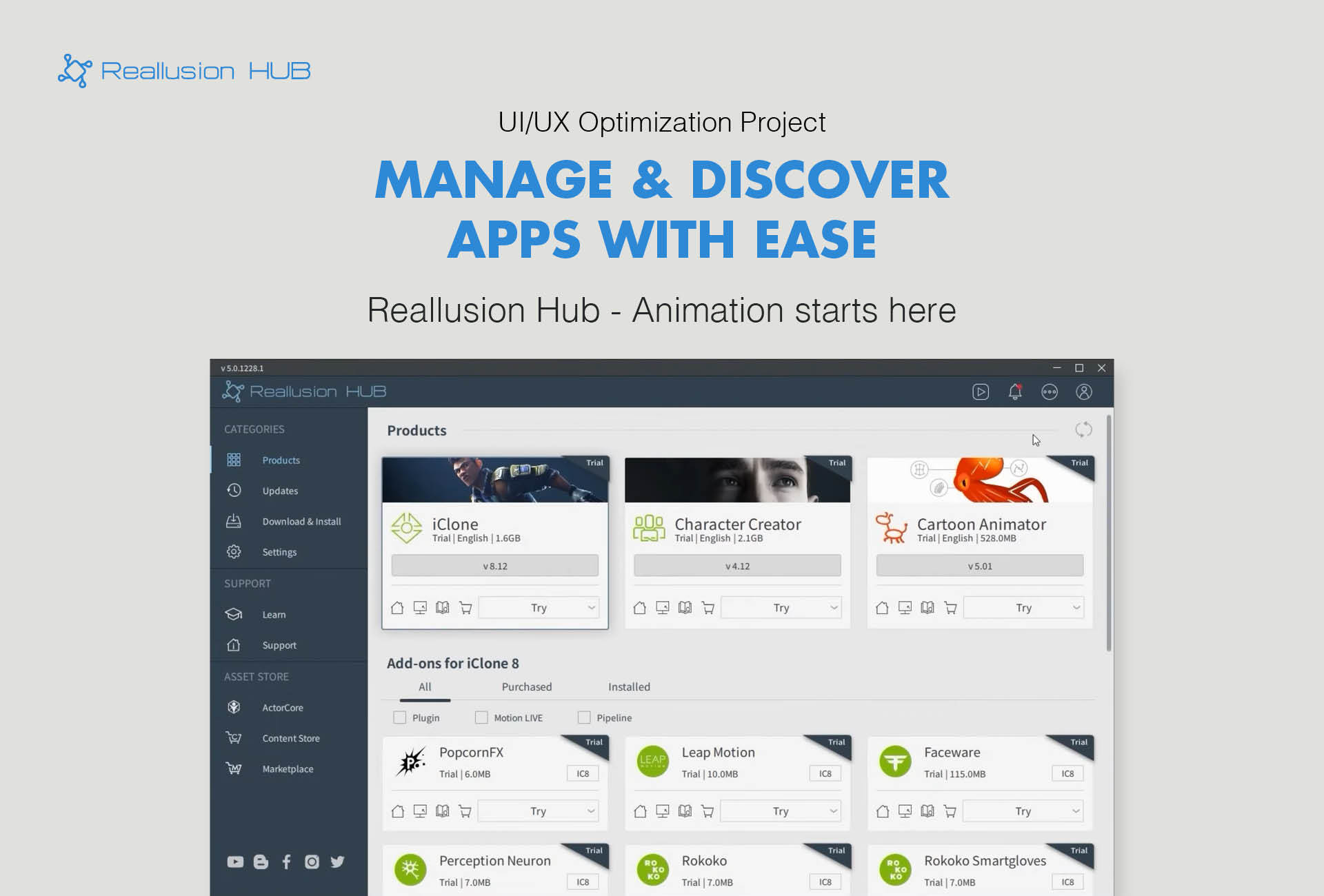 隨著產品線與服務不斷擴展,原有的軟體安裝管理系統——Hub,已無法完整且清楚的呈現三大主軟體的資源與附屬插件。專案從UI/UX設計優化,除了改善資訊陳列方式,也為Hub注入品牌個性,同時強化免費及可試用軟體的標示,期望提升安裝率。
