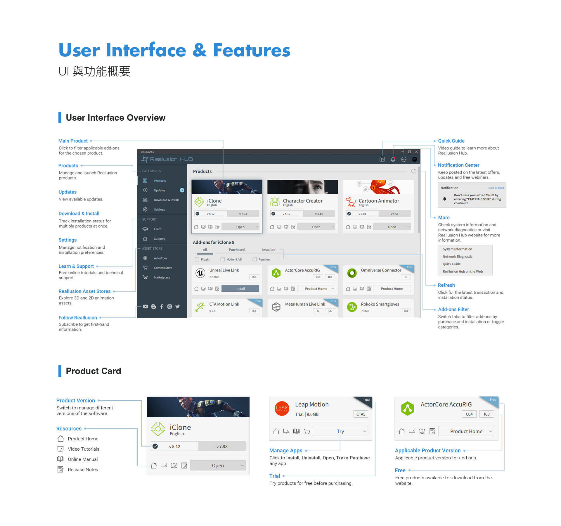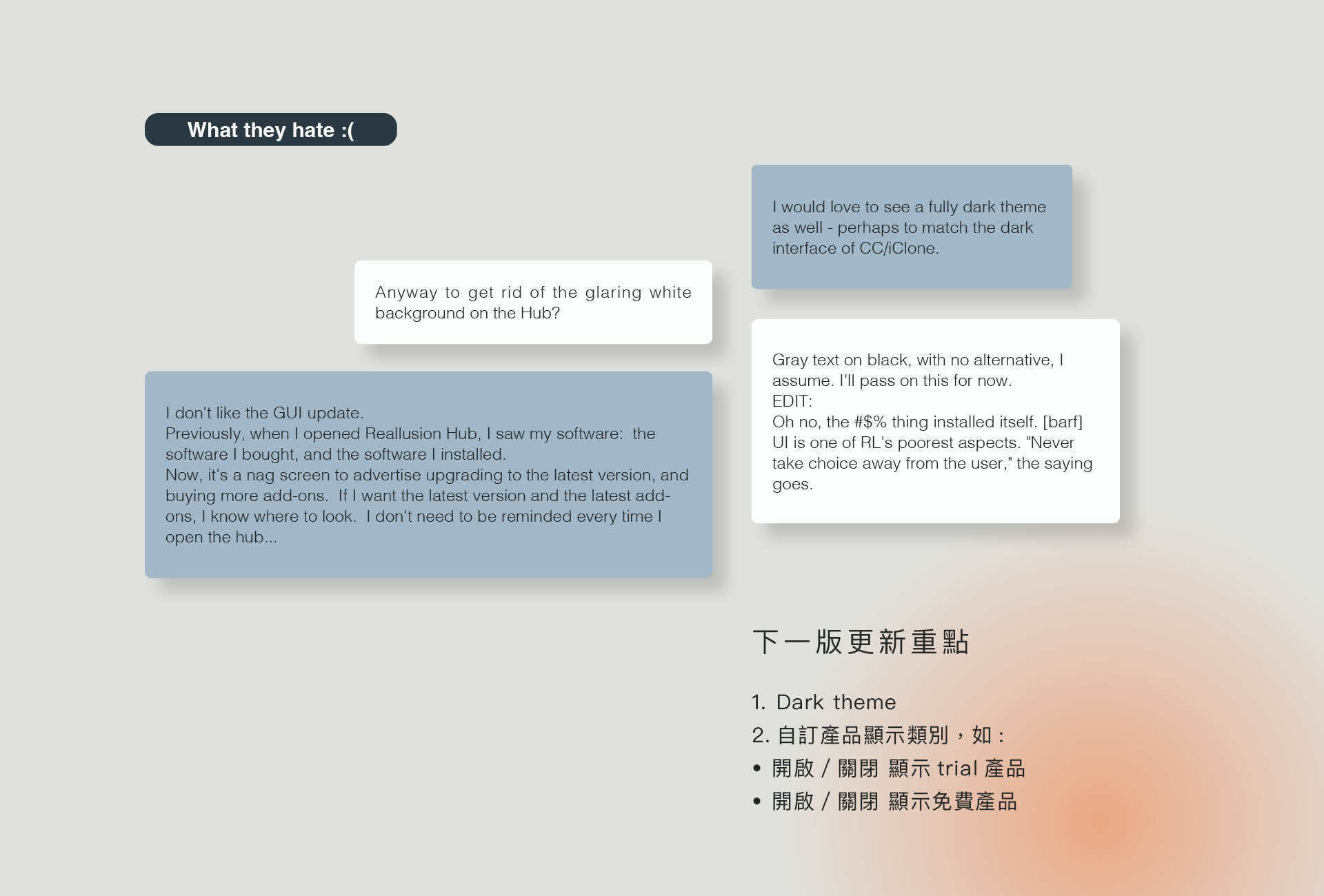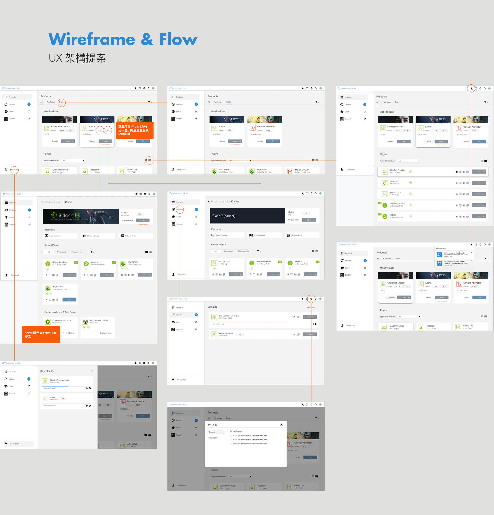 隨著產品線與服務不斷擴展,原有的軟體安裝管理系統——Hub,已無法完整且清楚的呈現三大主軟體的資源與附屬插件。專案從UI/UX設計優化,除了改善資訊陳列方式,也為Hub注入品牌個性,同時強化免費及可試用軟體的標示,期望提升安裝率。