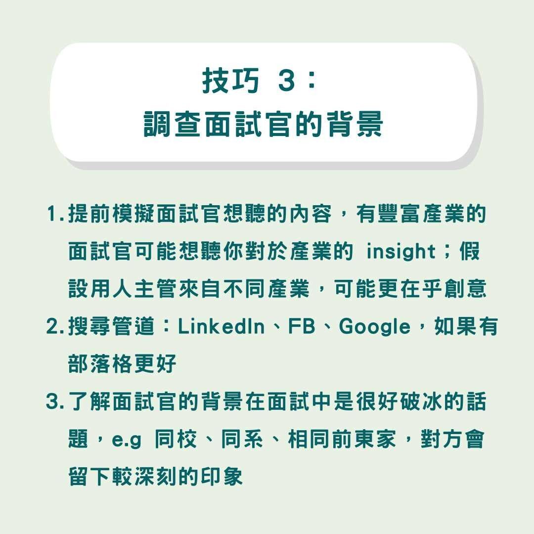 ? 調查面試官的背景(LinkedIn 很好用!)